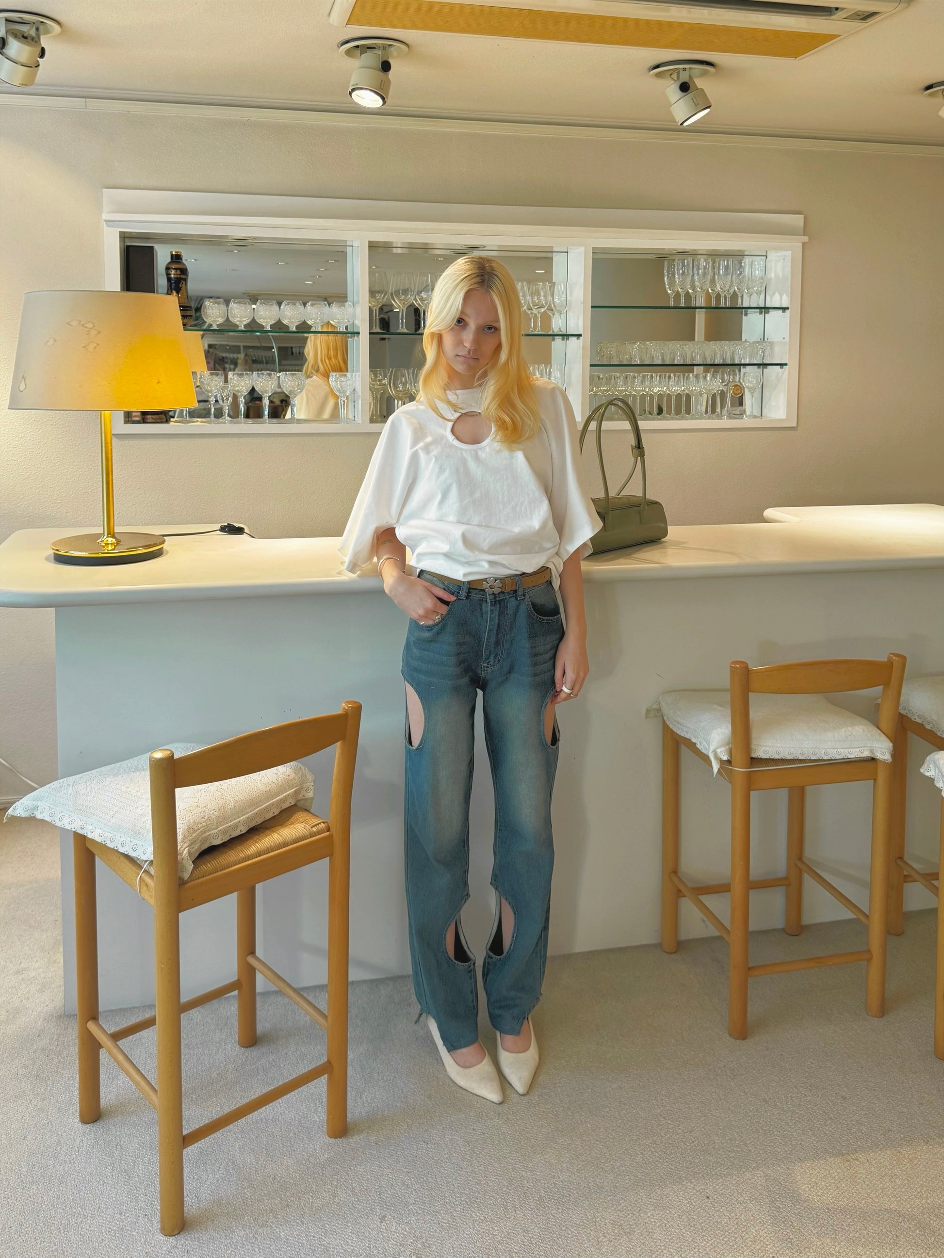 ところどころホールが空いたデザインにリメイクされたデニムパンツ。