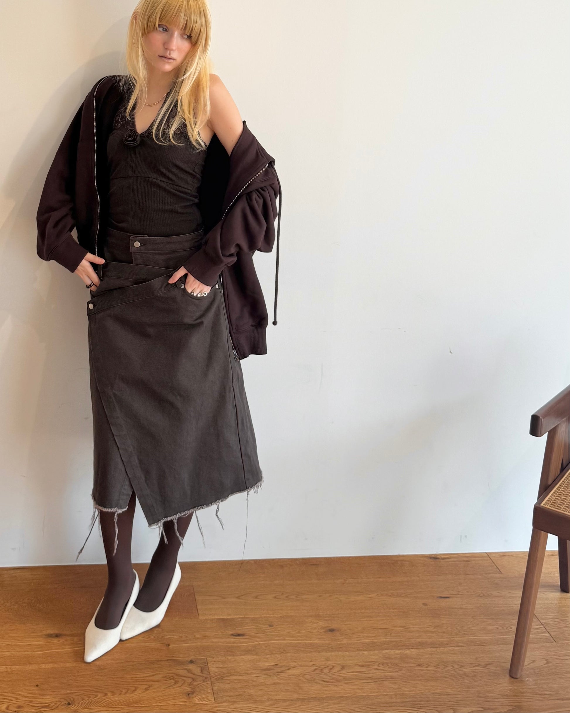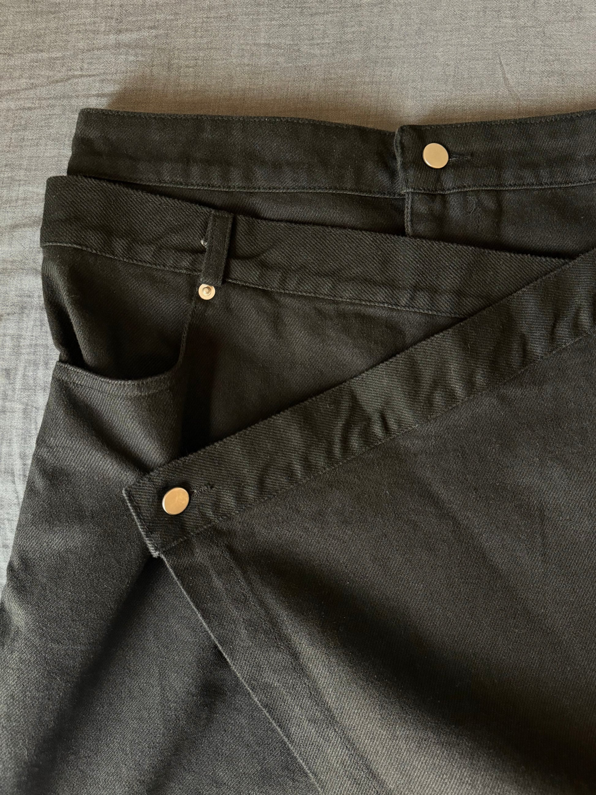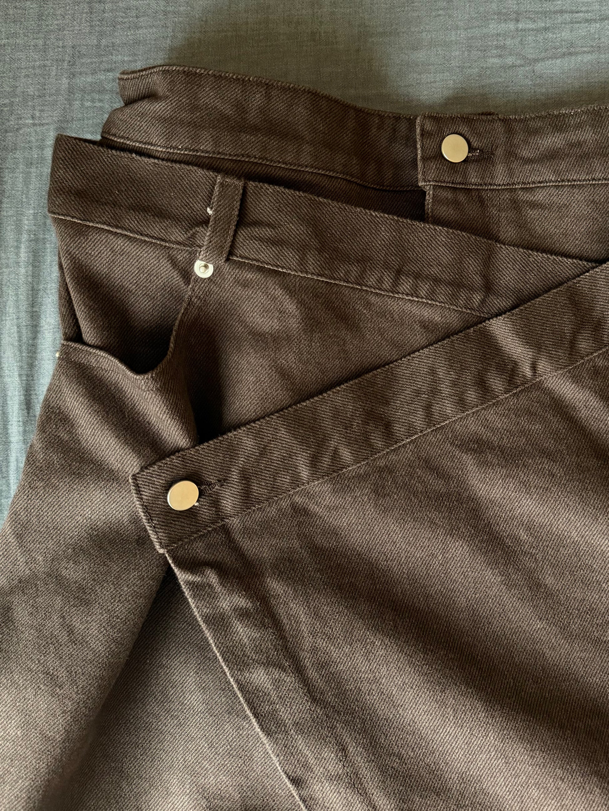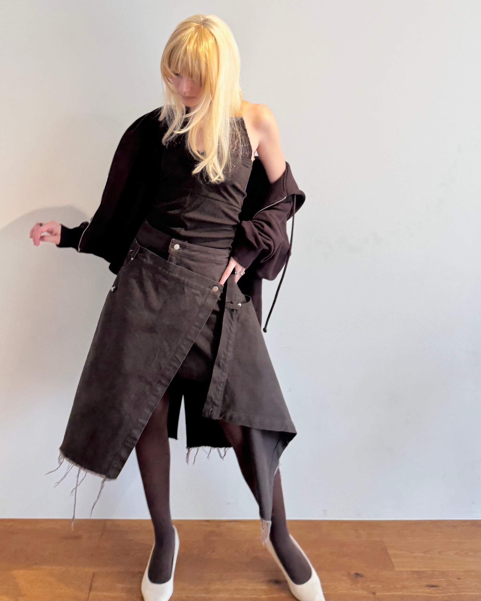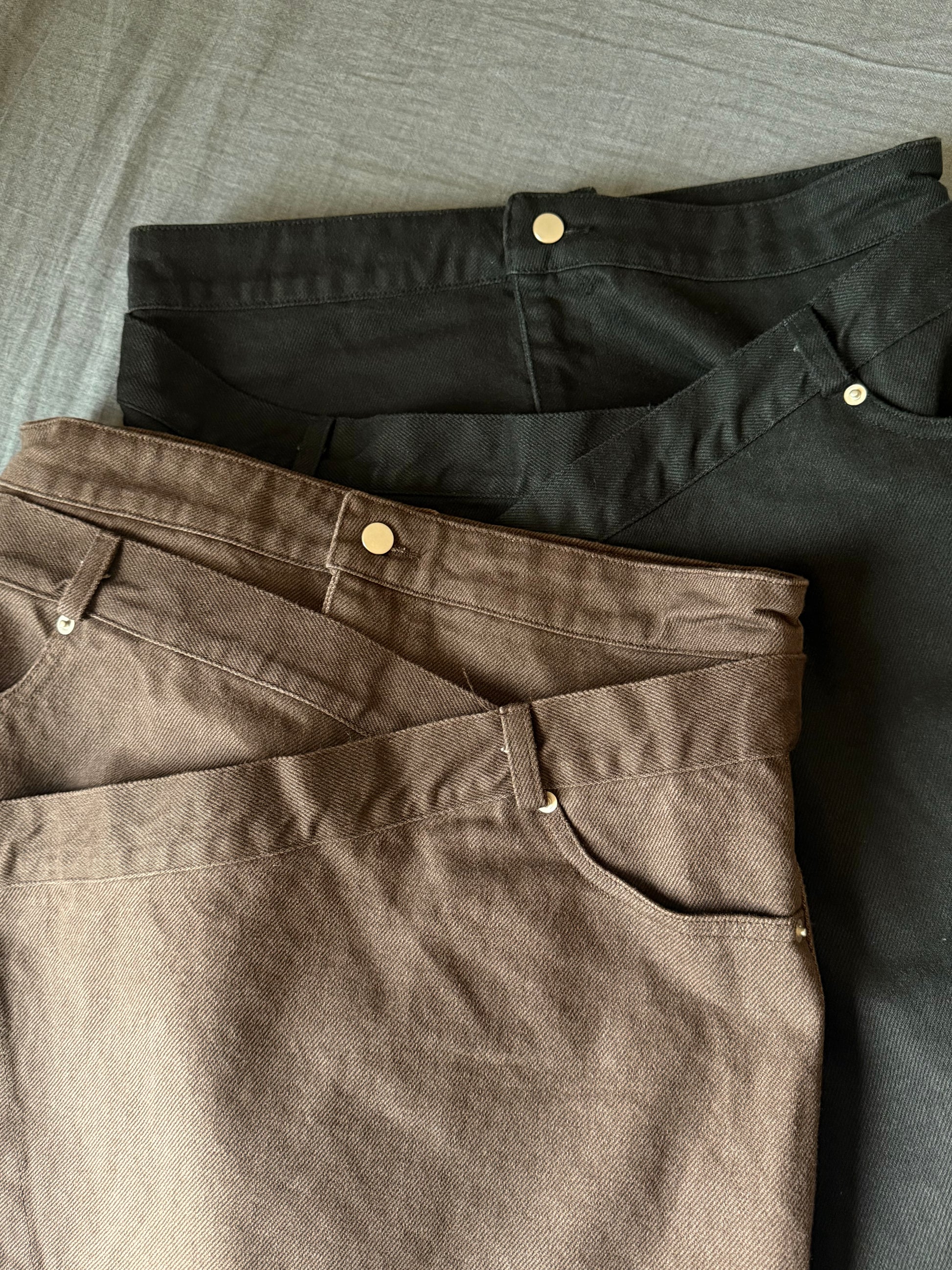 スカートのようなフェミニンなシルエットの巻き型デザインスカート。