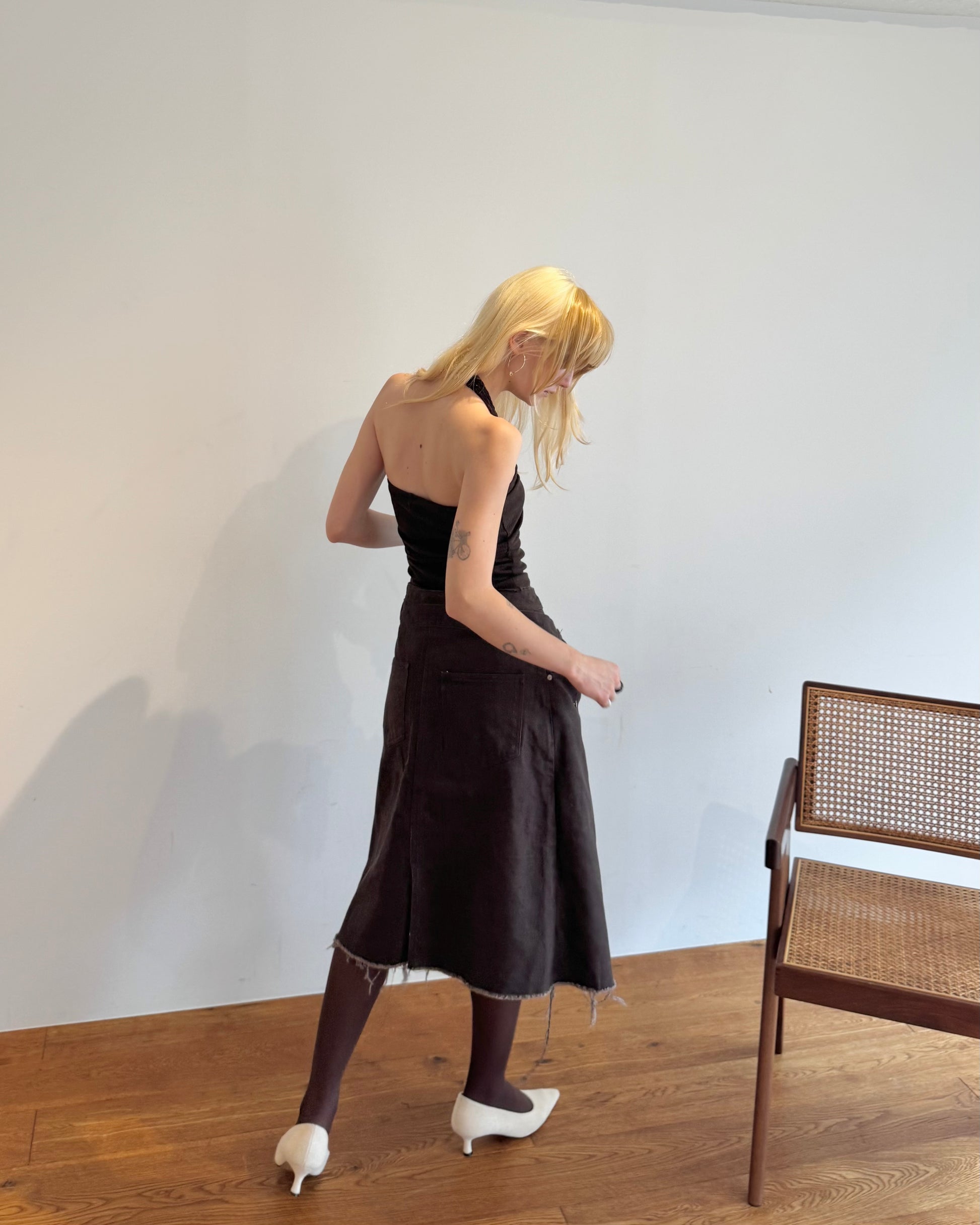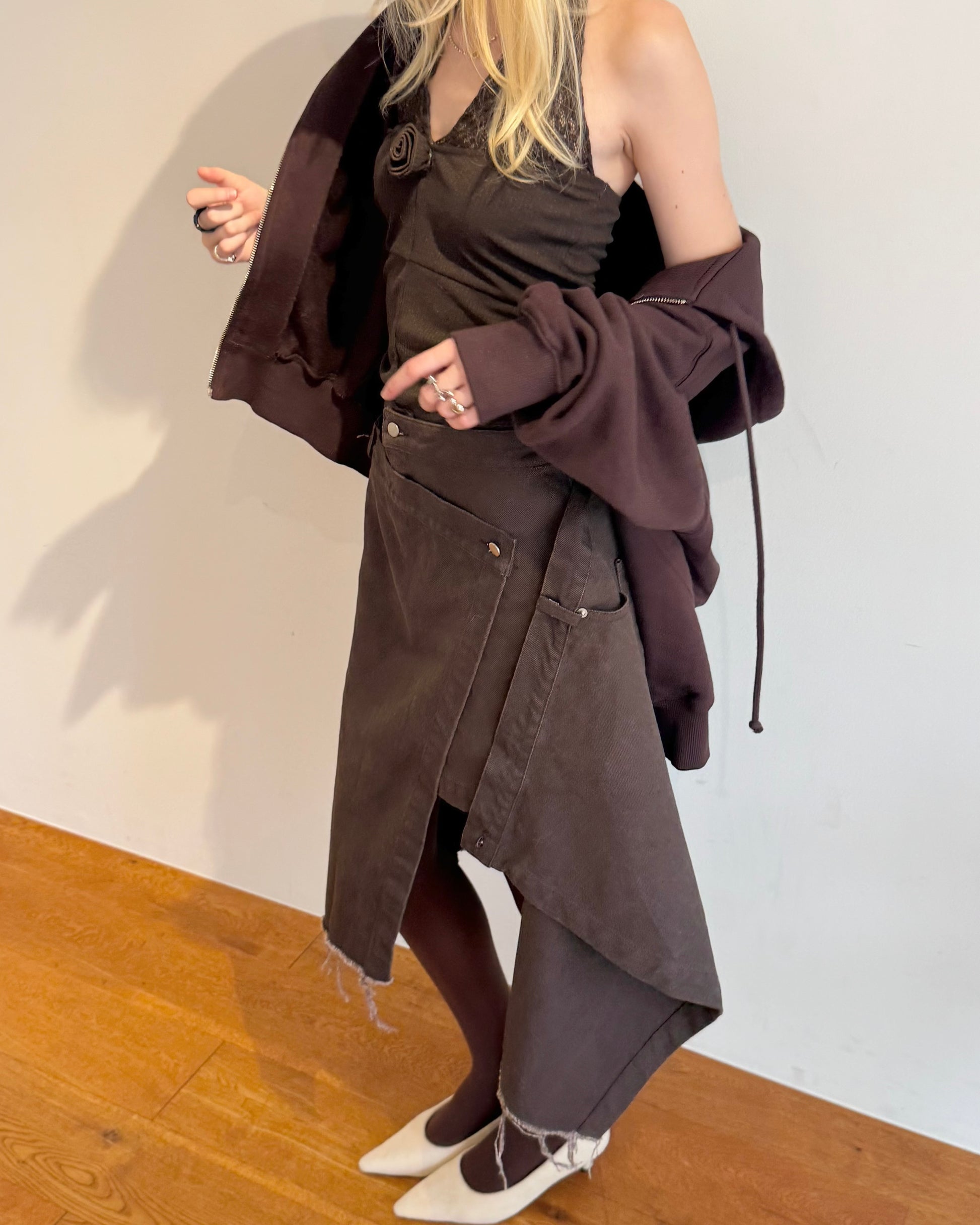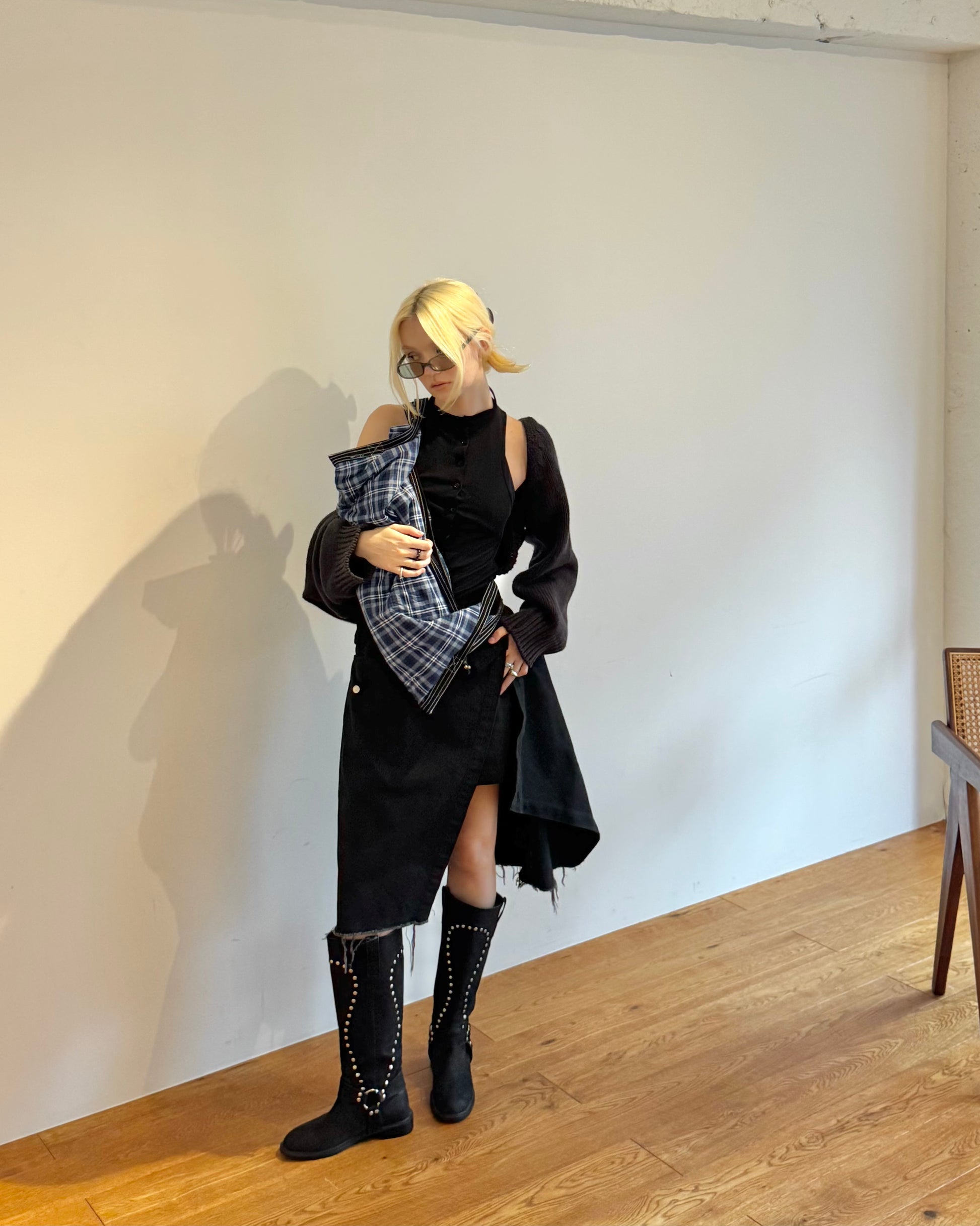 Tシャツやブラウス、スニーカーからヒールまで幅広く合わせやすく、シーズンを問わず活躍する1枚。