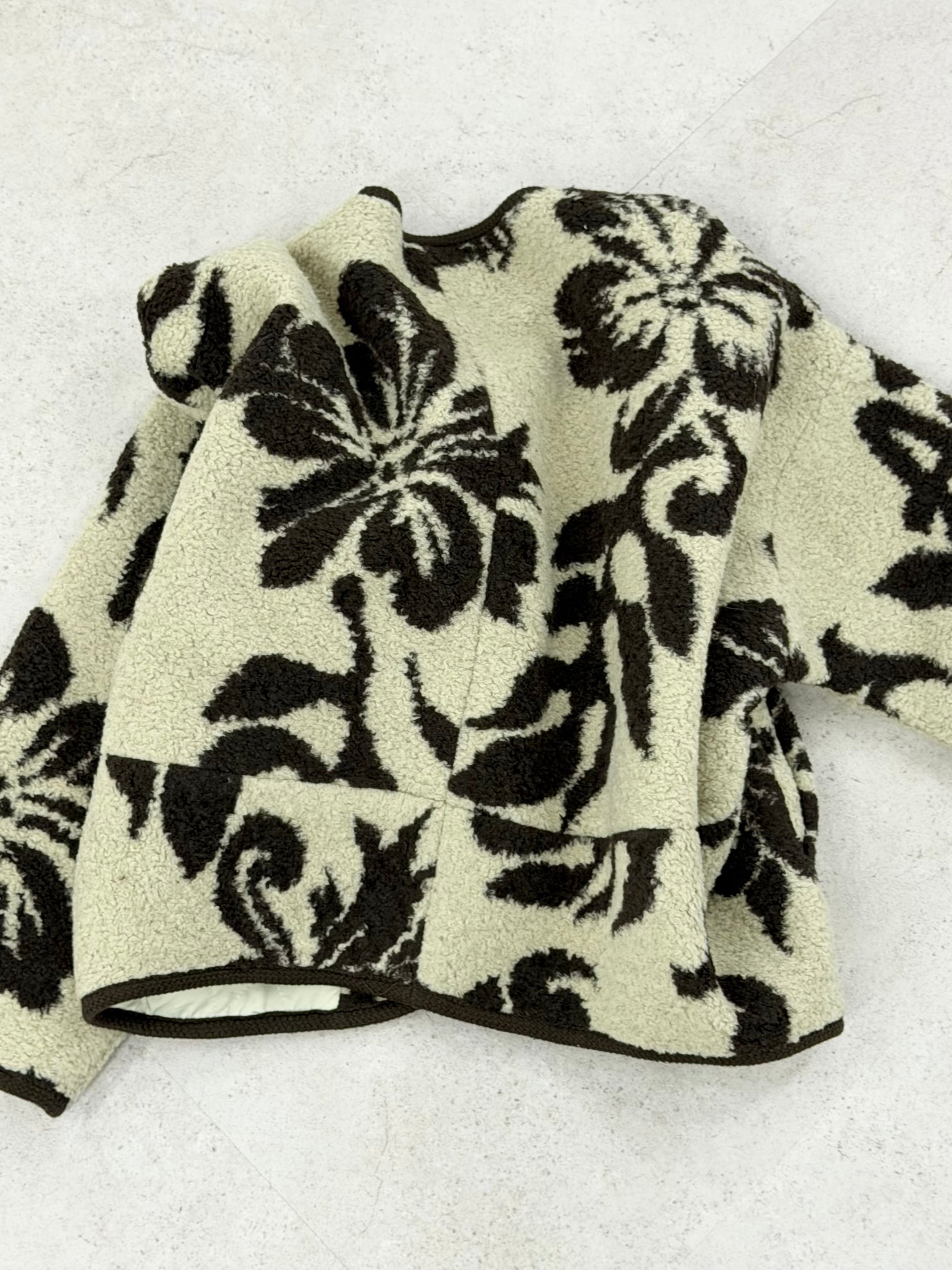 トロピカルなハイビスカス柄を落とし込んだ、存在感のあるボアコート。