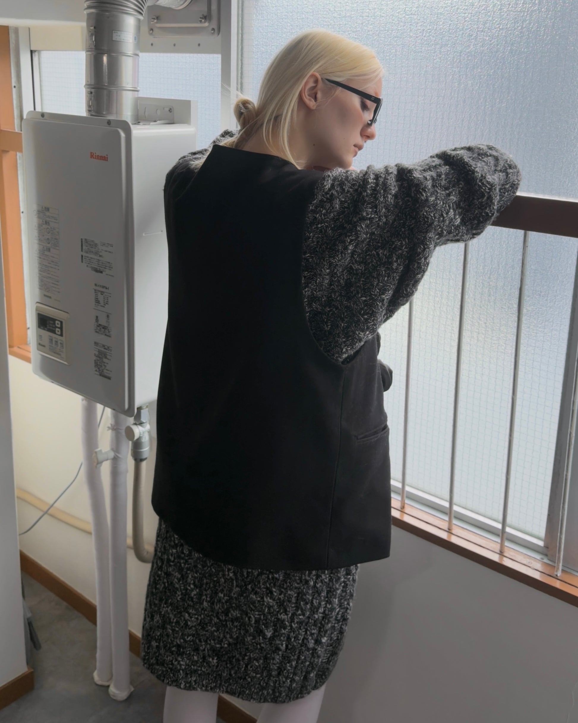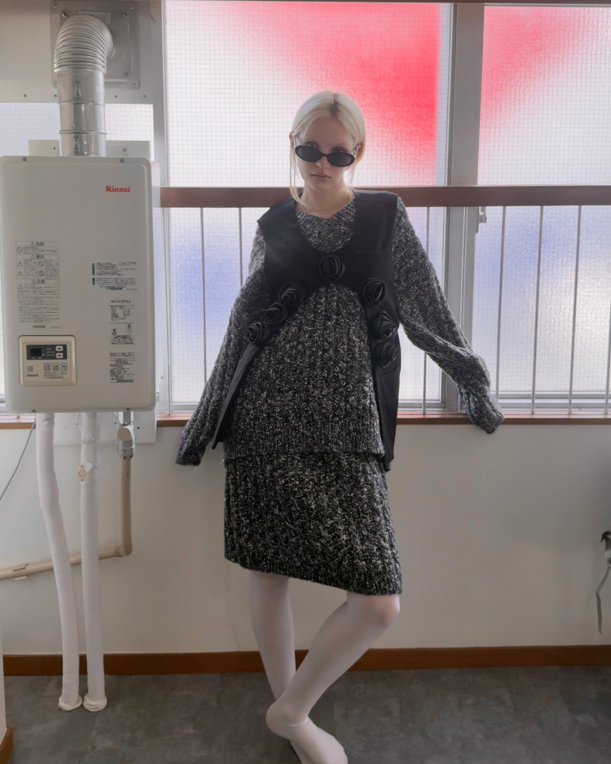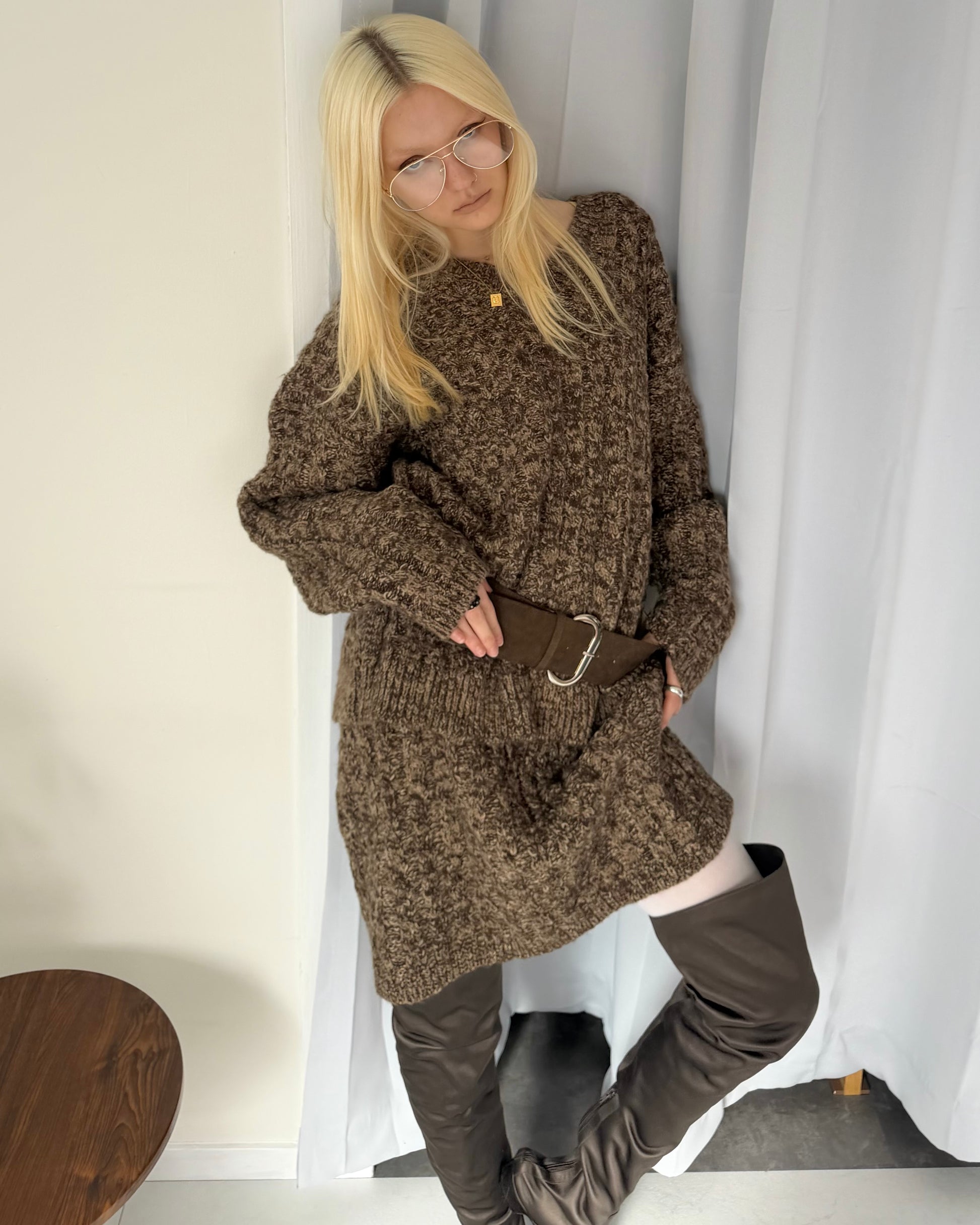 ミックスカラーの編み地が目を惹くニットトップスとスカートのセットアップ。
