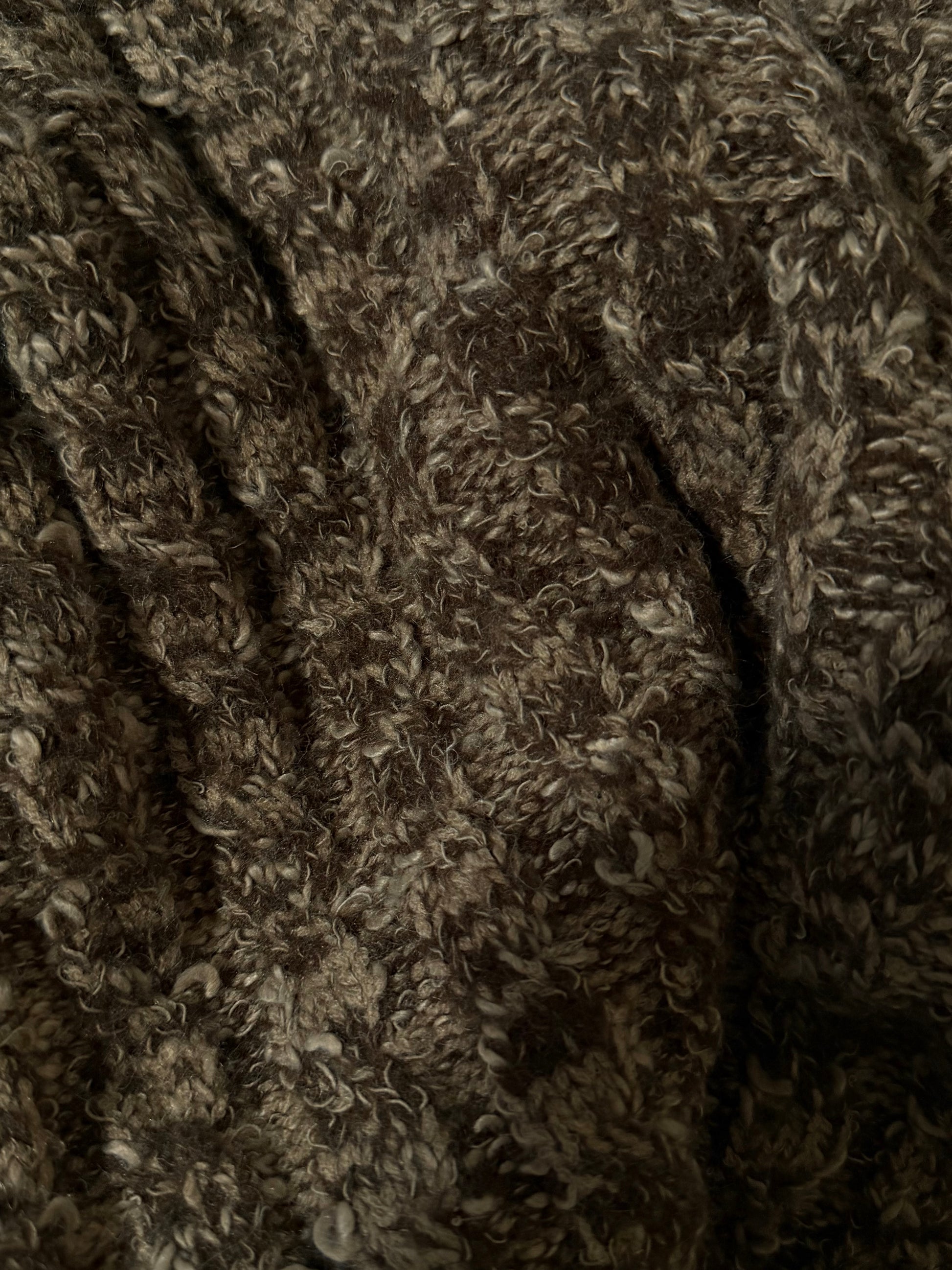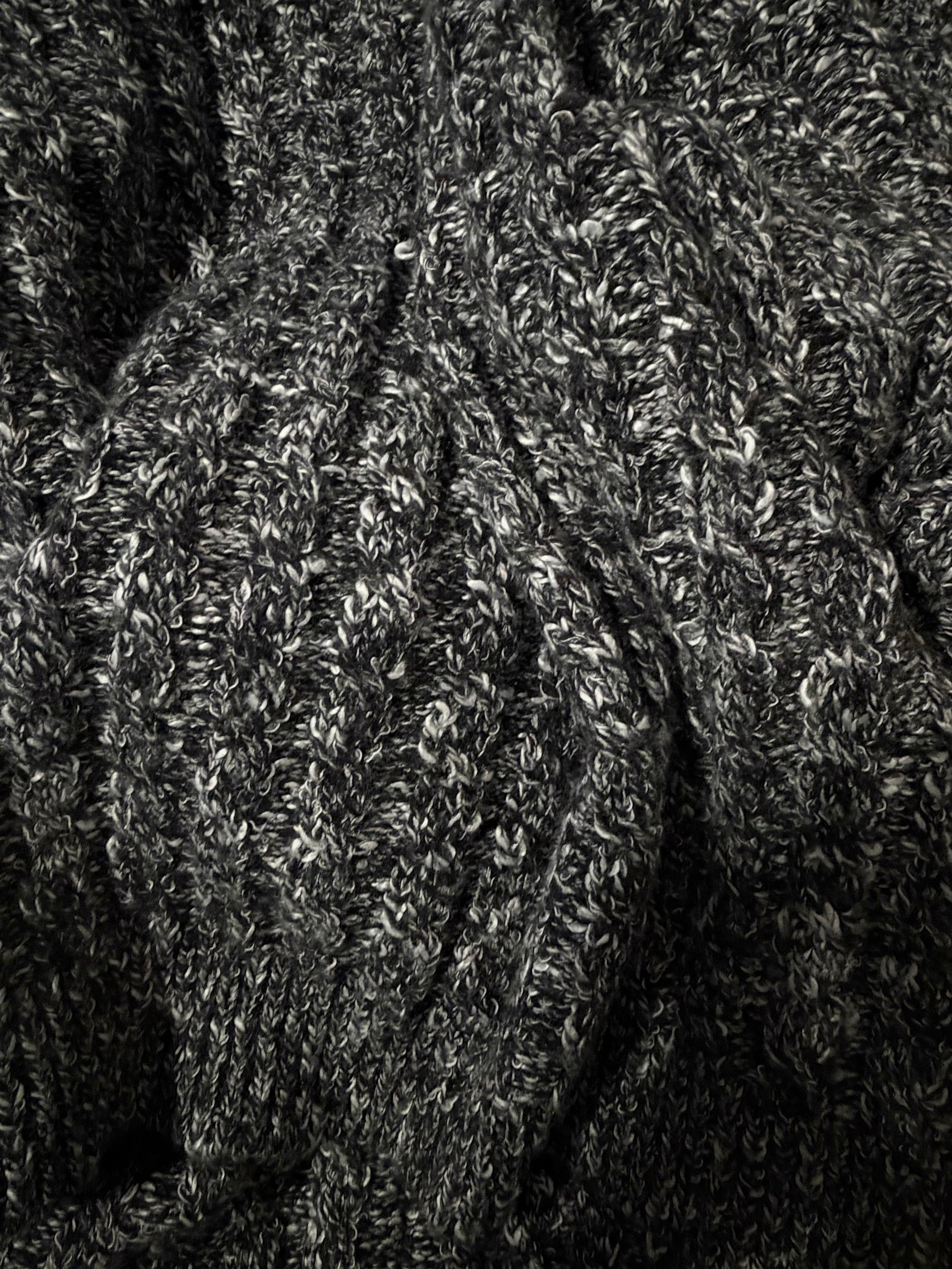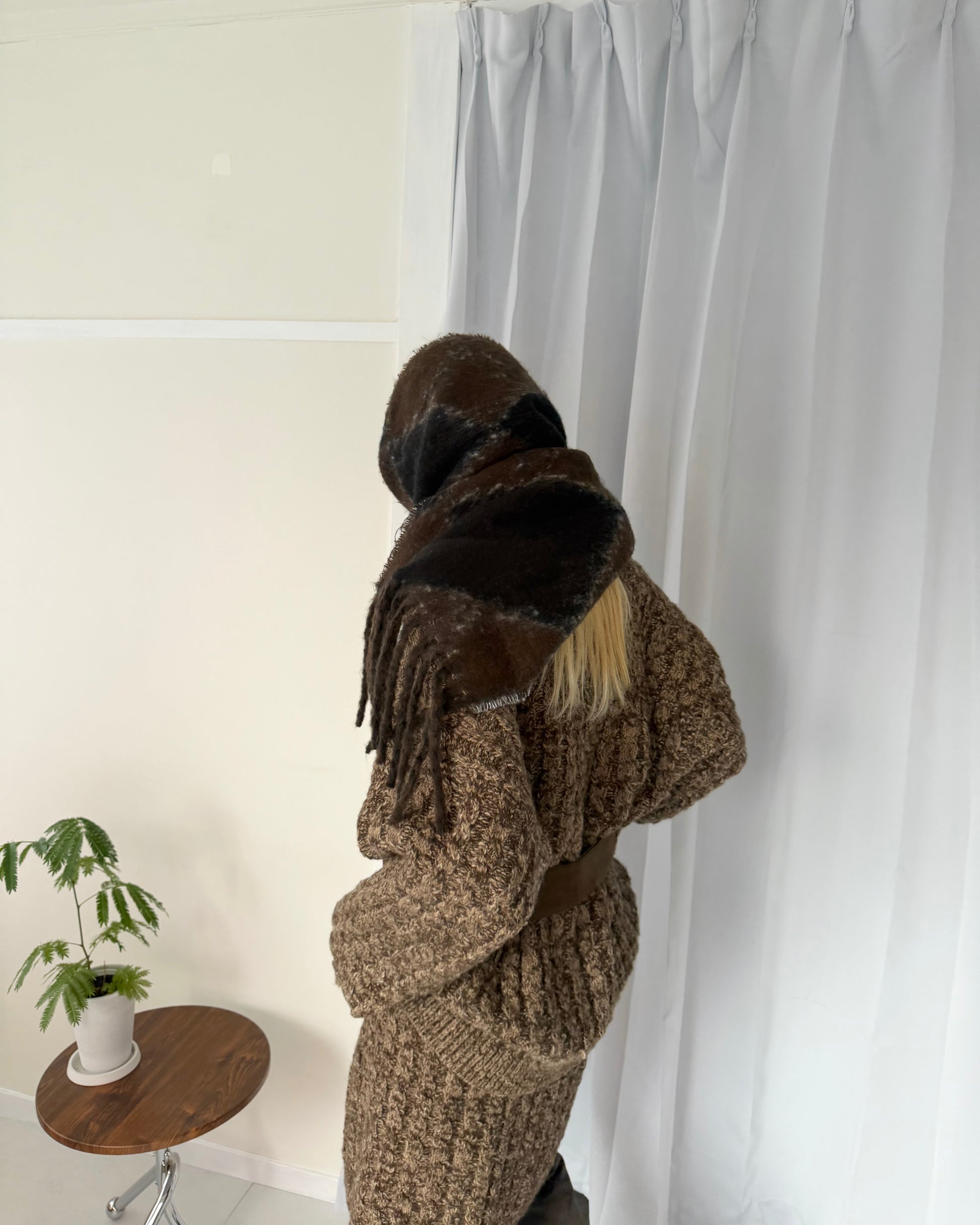 ミックスカラーの編み地が目を惹くニットトップスとスカートのセットアップ。