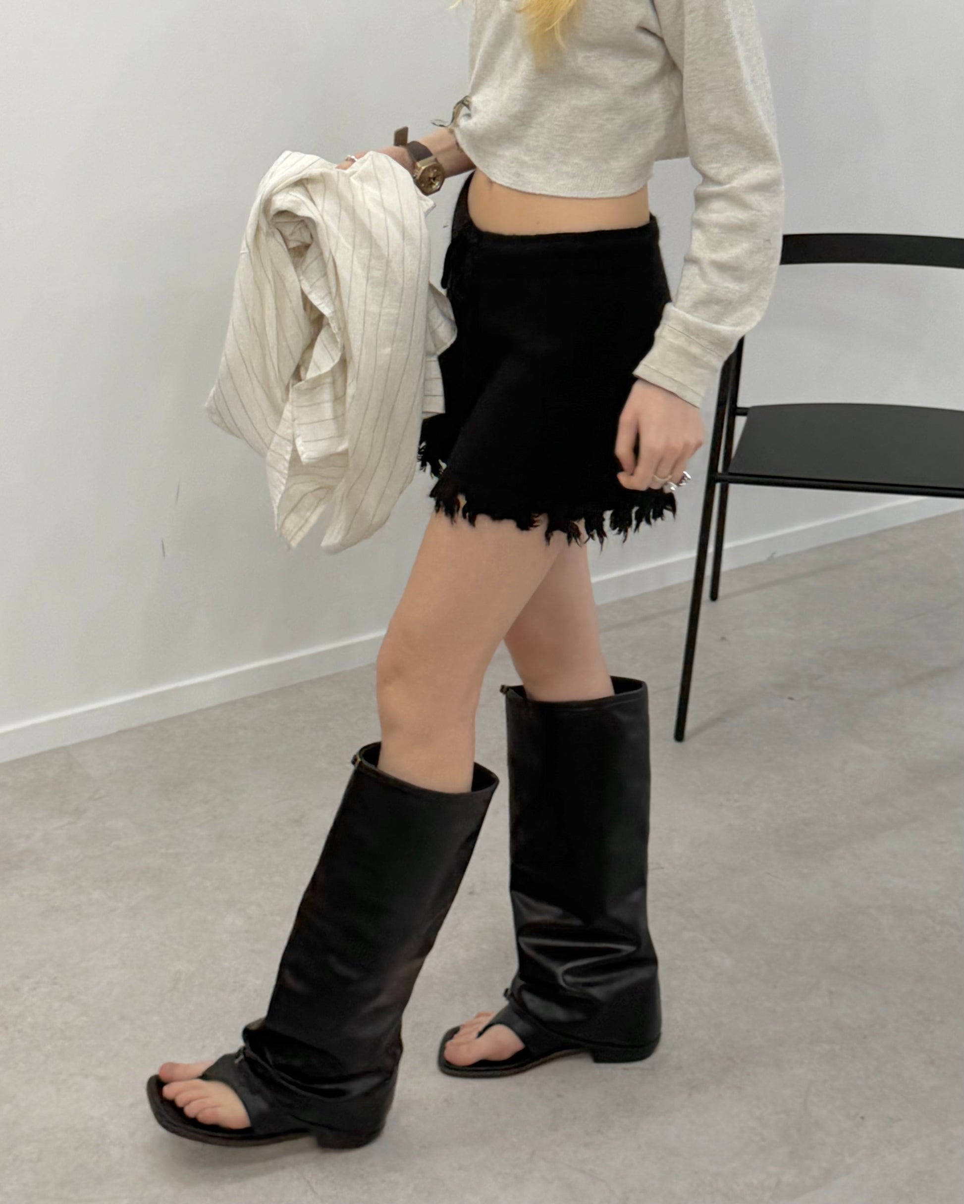 足先がサンダル仕様のロングブーツ。