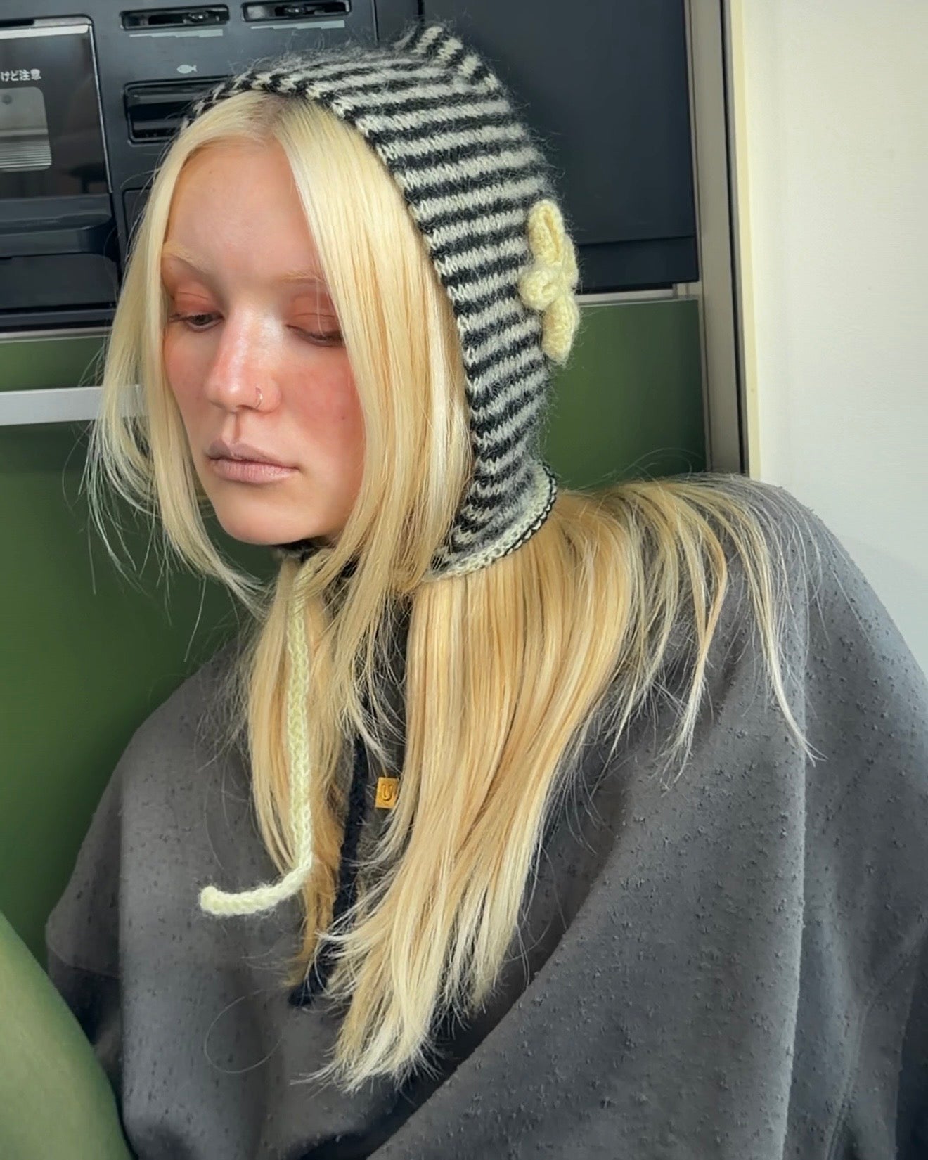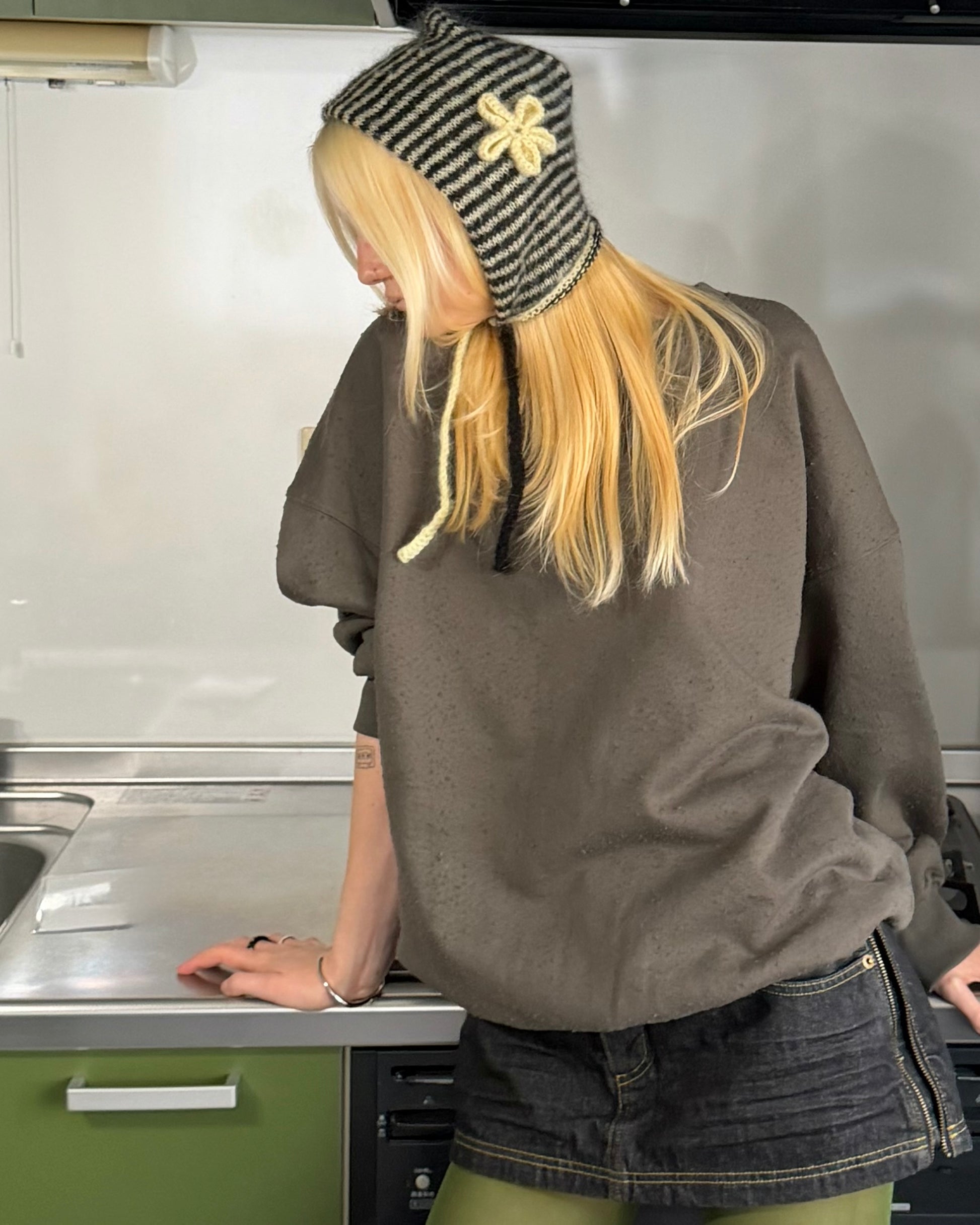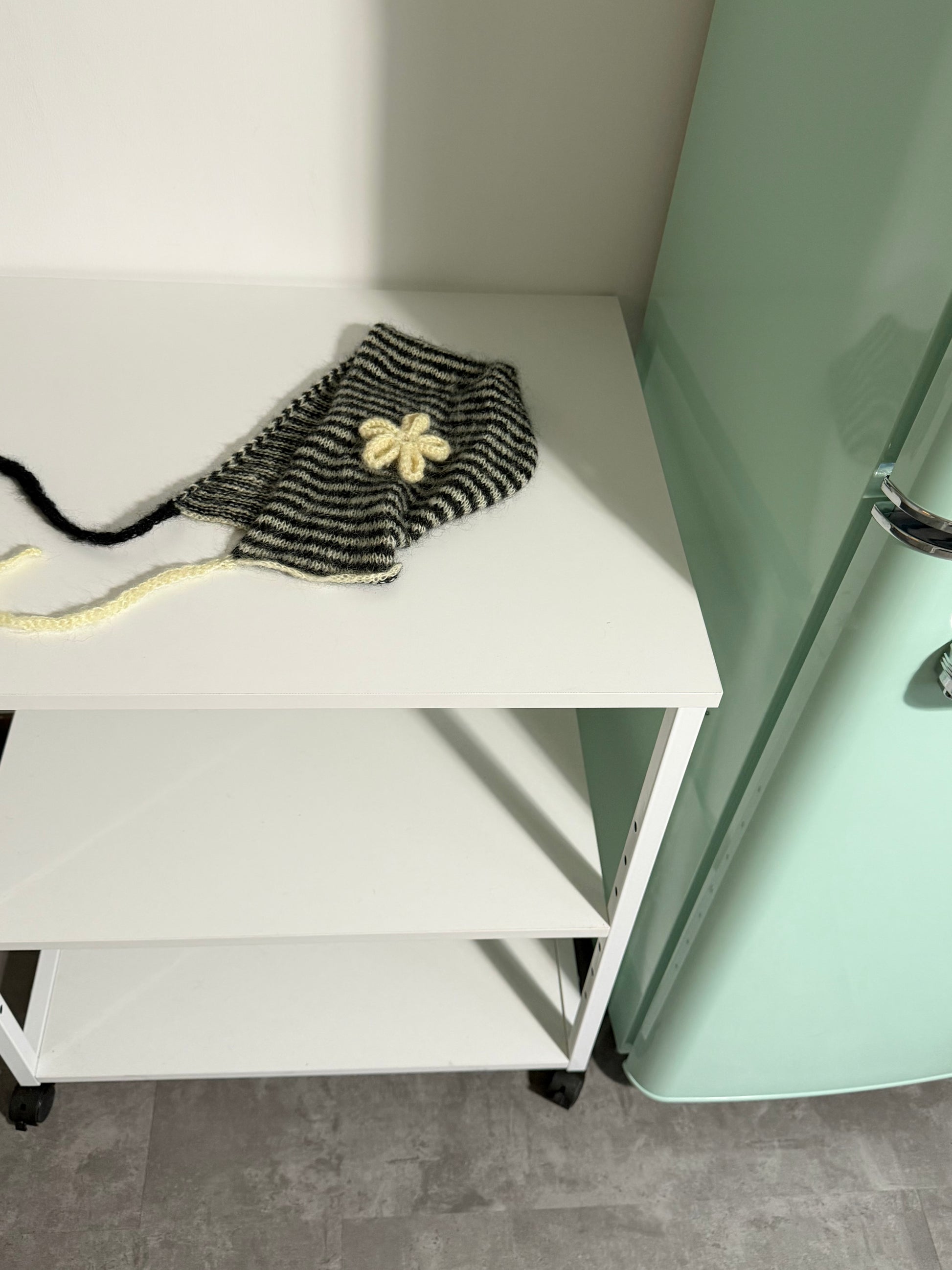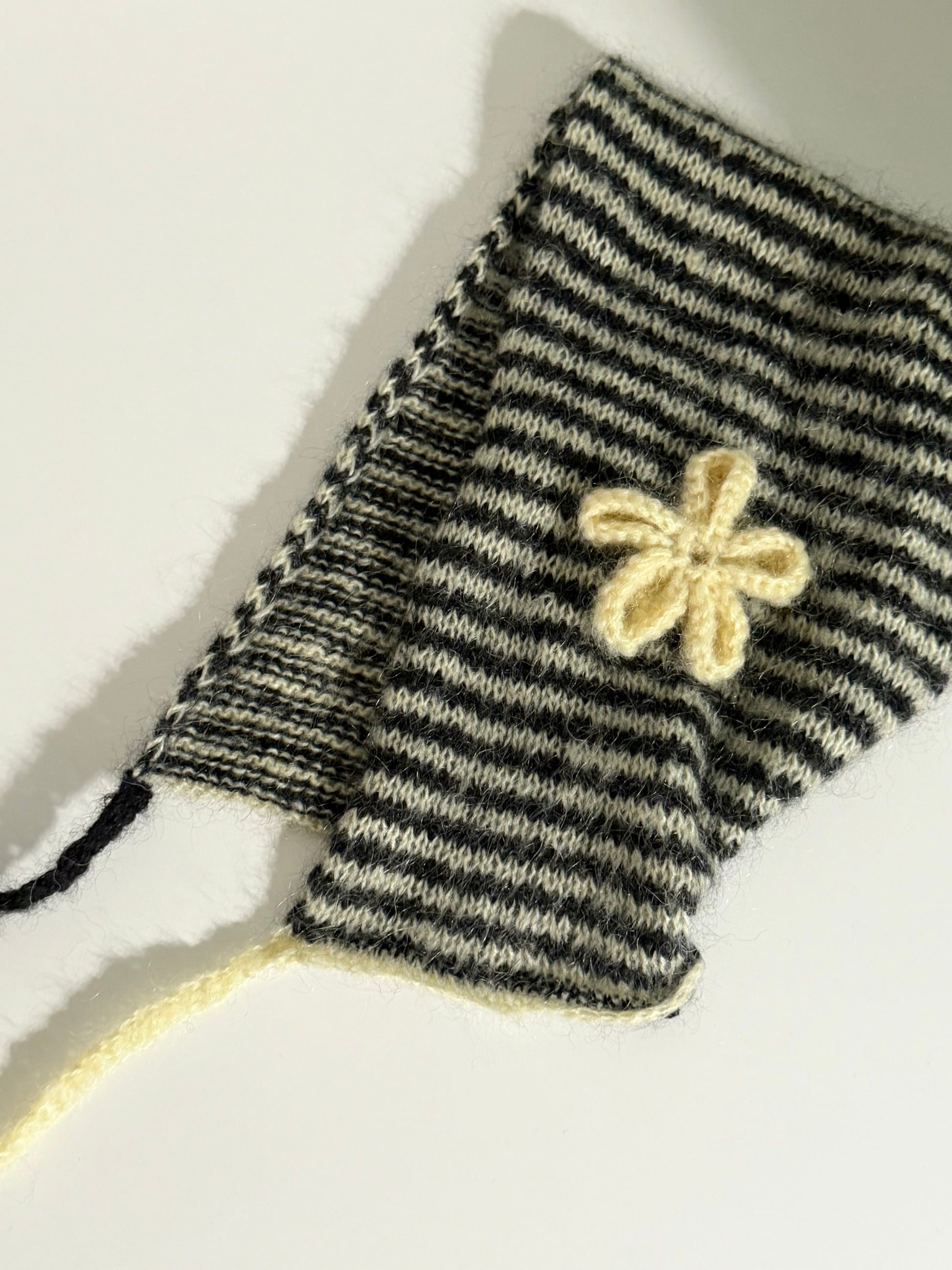 左右に色違いのフラワーモチーフを施したビーニー。